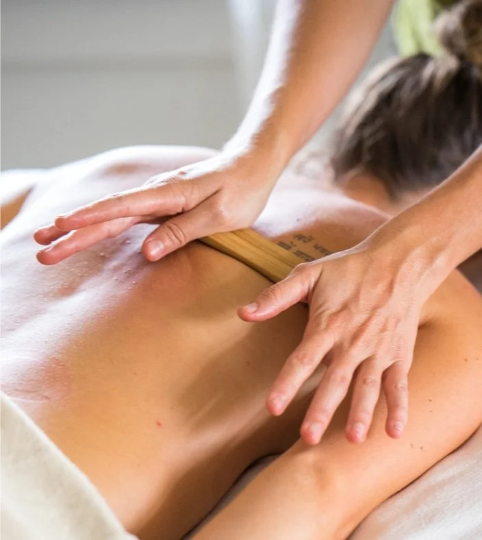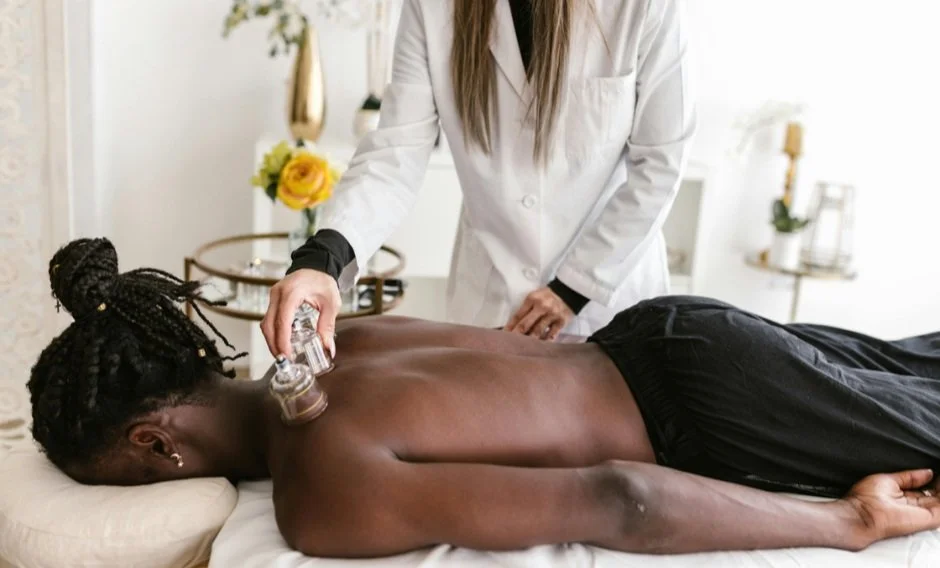Cupping creates gentle suction to lift fascia and muscle, improving circulation and releasing tension. It’s deeply relaxing and especially helpful for chronic pain, injury recovery, and detox support.